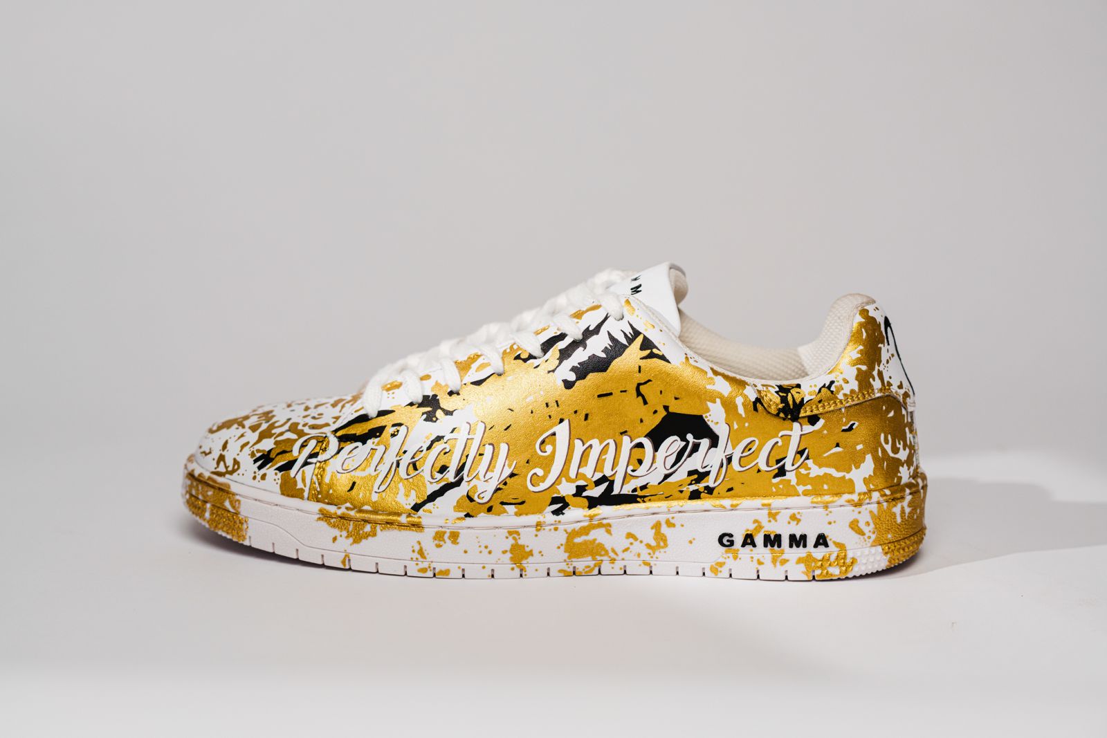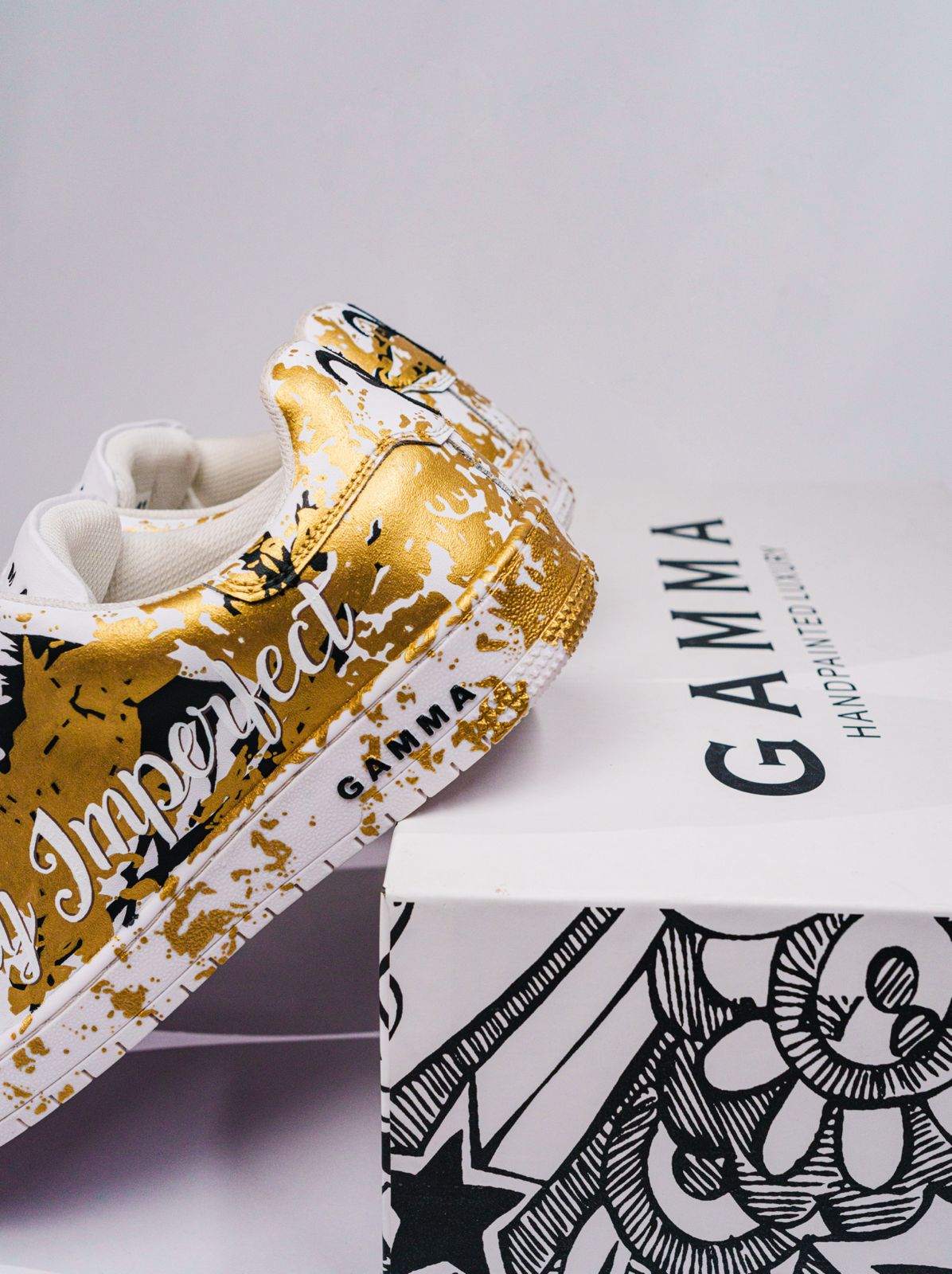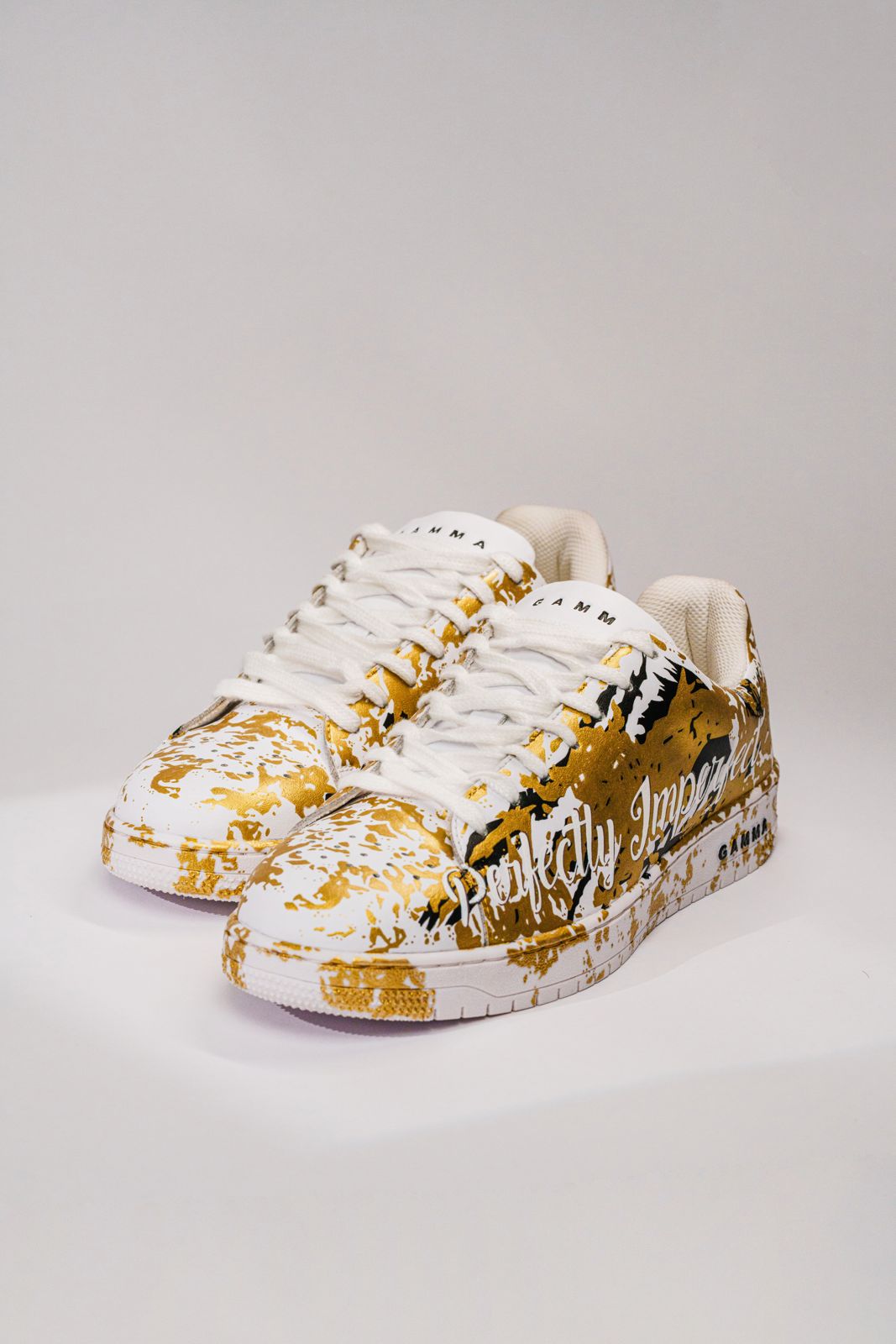 This sneaker showcases a premium white canvas with touches of gold and black detailing, delivering an artistic style. Bold yet authentic, the design is elevated by the hand-written phrase Perfectly Imperfect along the side, honouring individuality. It celebrates the beauty in flaws, reminding us that authenticity is the purest form of perfection.