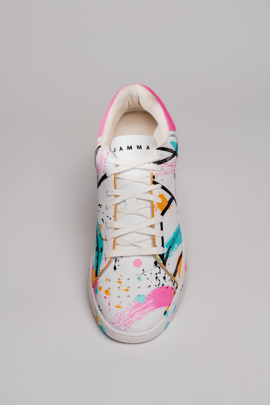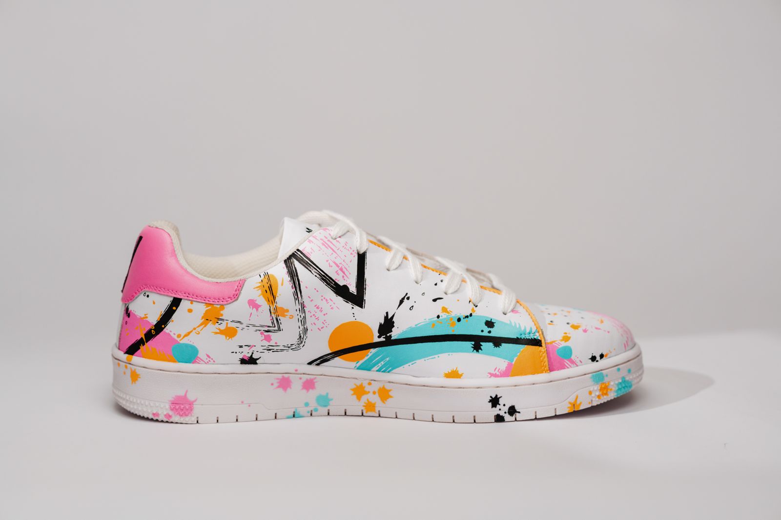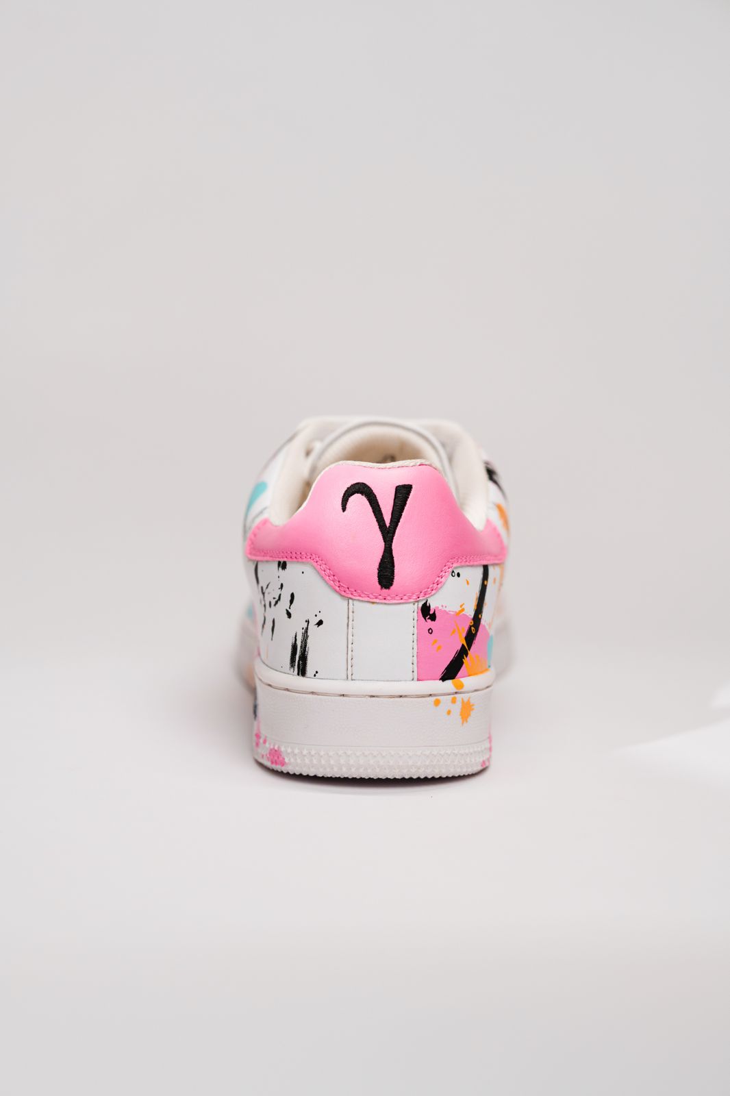 This sneaker showcases powerful brushstrokes and abstract artistry, striking a balance of raw energy and elegance. Vivid colours and playful textures that glide across premium white leather. Someone who finds joy in colour and confidence in craft, these sneakers are pure sunshine for the streets.