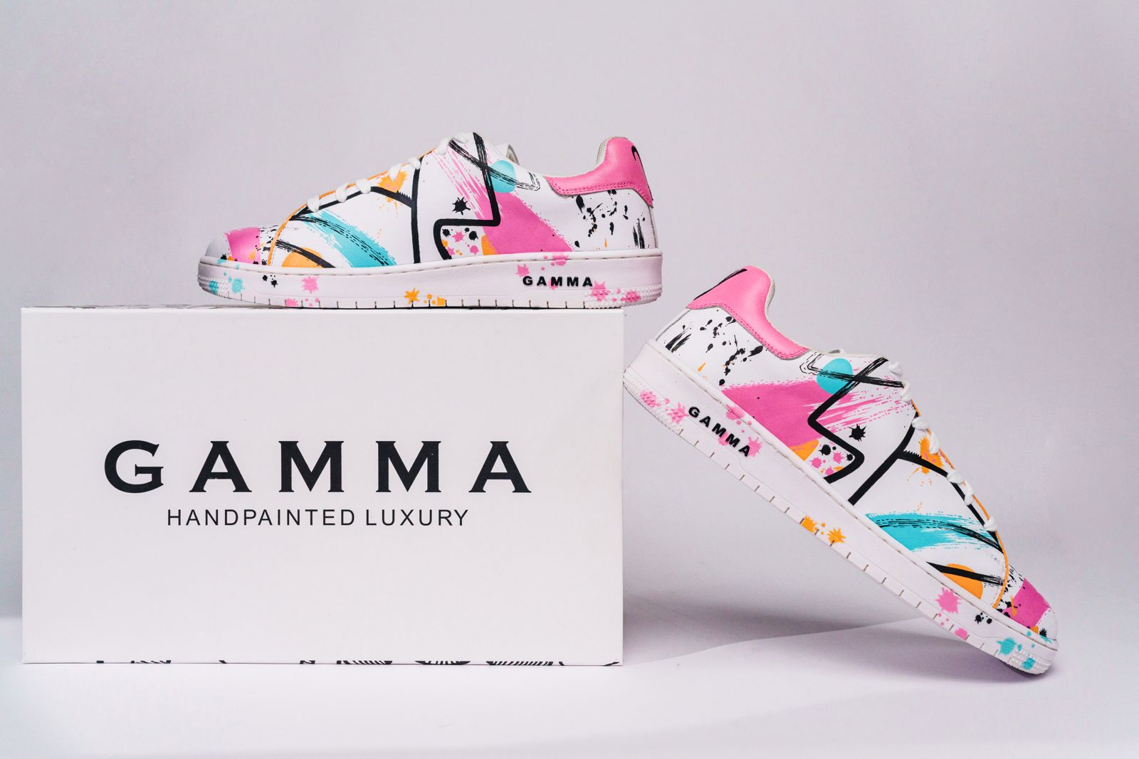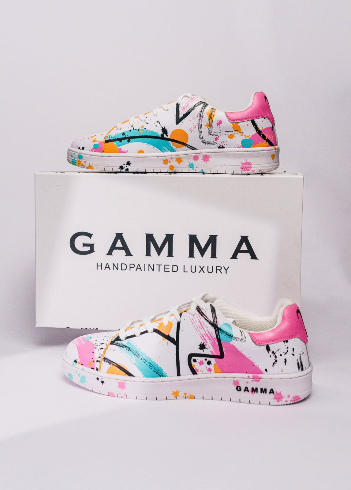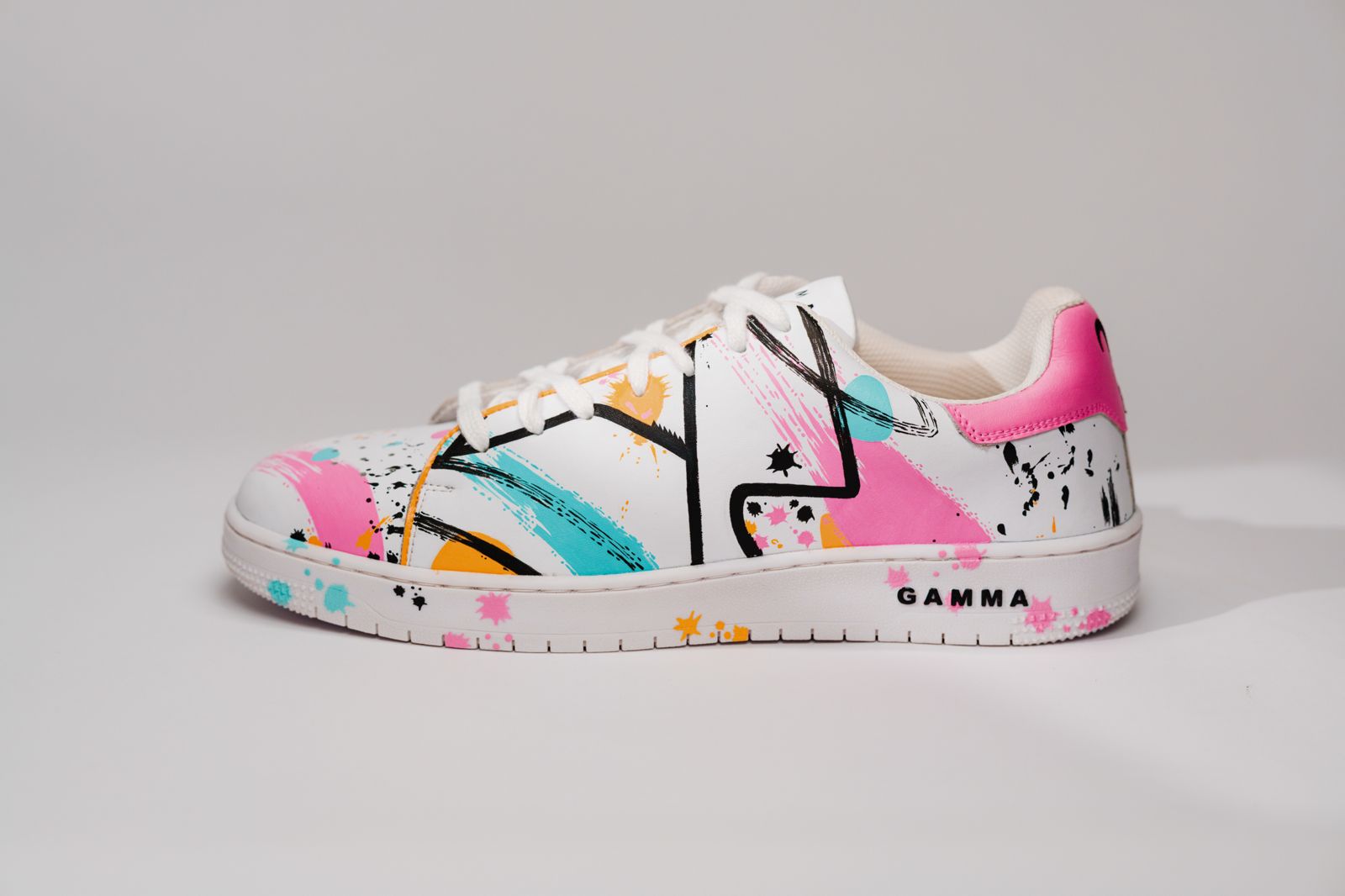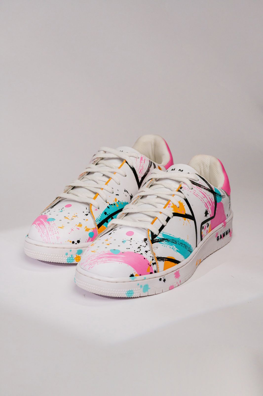 This sneaker showcases powerful brushstrokes and abstract artistry, striking a balance of raw energy and elegance. Vivid colours and playful textures that glide across premium white leather. Someone who finds joy in colour and confidence in craft, these sneakers are pure sunshine for the streets.